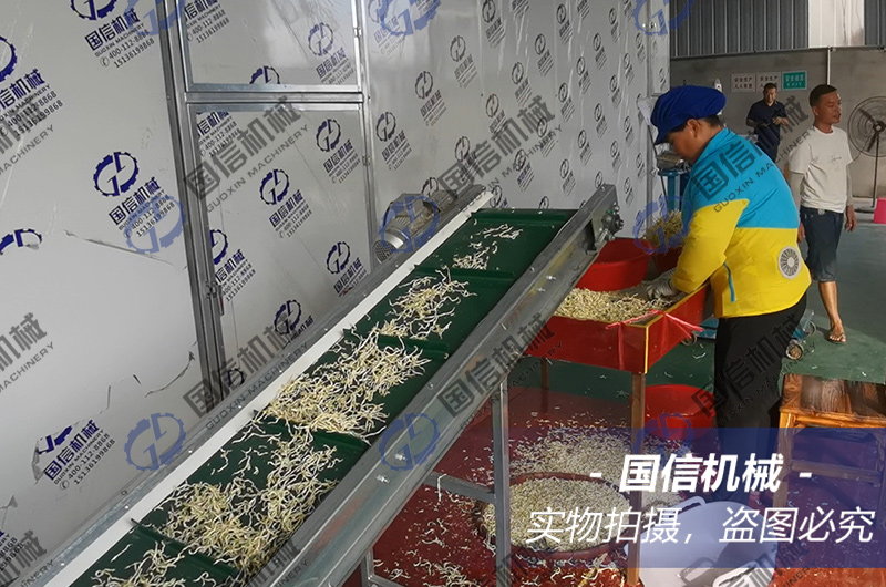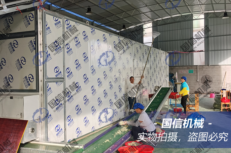 网带式木瓜丝烘干机由自动上料装置、烘干主机、自动出料装置、电控系统、热源系统等构成,与物料接触的部位,均采用304不锈钢网带,保证了成品干木瓜丝的品质。把处理好的木瓜丝把放在上料输送机上,铺料厚度自动设置,输送机会将木瓜丝输送进烘干主机内,在烘干机内部有多层不锈钢网带,木瓜丝随网带自动运行,在烘干主机内部呈“s”形运转,实现自下而上的逐层烘干,在运转过程中,完成翻转,使木瓜丝的烘干更加均匀。烘干完成之后,木瓜丝随出料输送机自动输出。在整个烘干过程中,热空气从烘干主机底部进入,逐层穿透网带,完成木瓜丝的烘干过程。