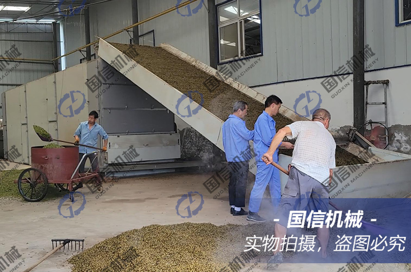 连翘烘干机的工作原理是将连翘放置到输送带上,经过输送带上的匀料装置后,平铺到烘干机网带上,输送至烘干机内部,然后通过网带逐一过渡到下一层,每层之间设置有导料和反转装置,使连翘充分与载热体接触,得到循环翻转,烘干完成后,连翘被出料输送机带出机体。载热体由风机引入到烘干机内部,引风机产生的风速、风压使载热体充分、均匀的散布在烘干机底部,由于下部压力大于上面压力,载热体由下向上运动,穿过每层网带,使连翘与载热体充分接触,提高烘干效率。